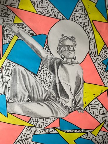 Process board showing experiments with croquis, hand-drawn and digital illustrations, and various art styles and mediums. Used to test techniques, proportions, and visual approaches before developing final designs.